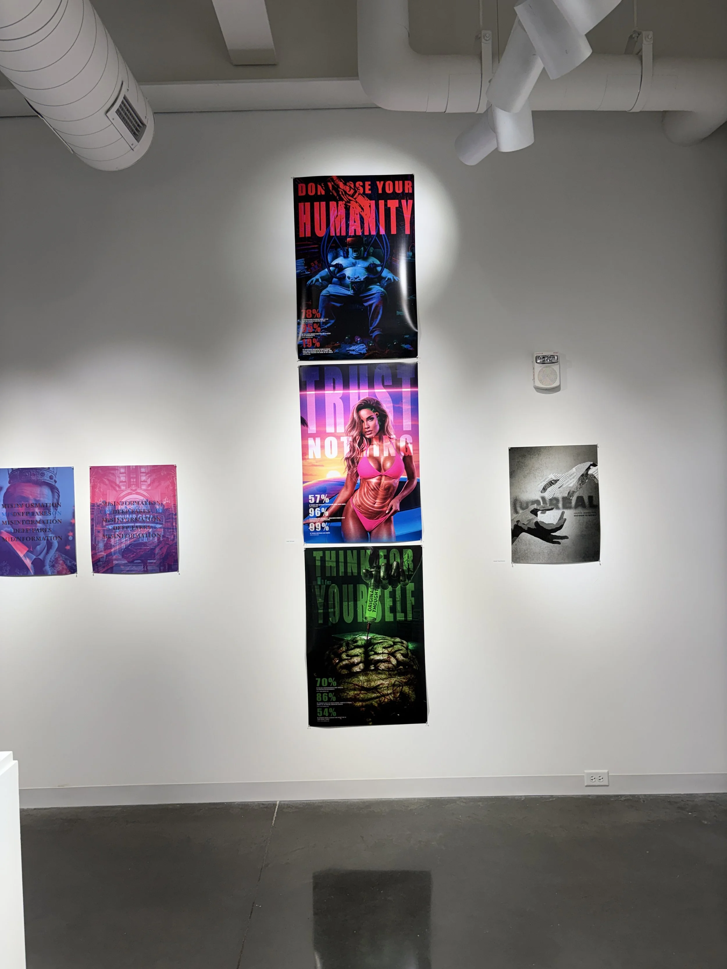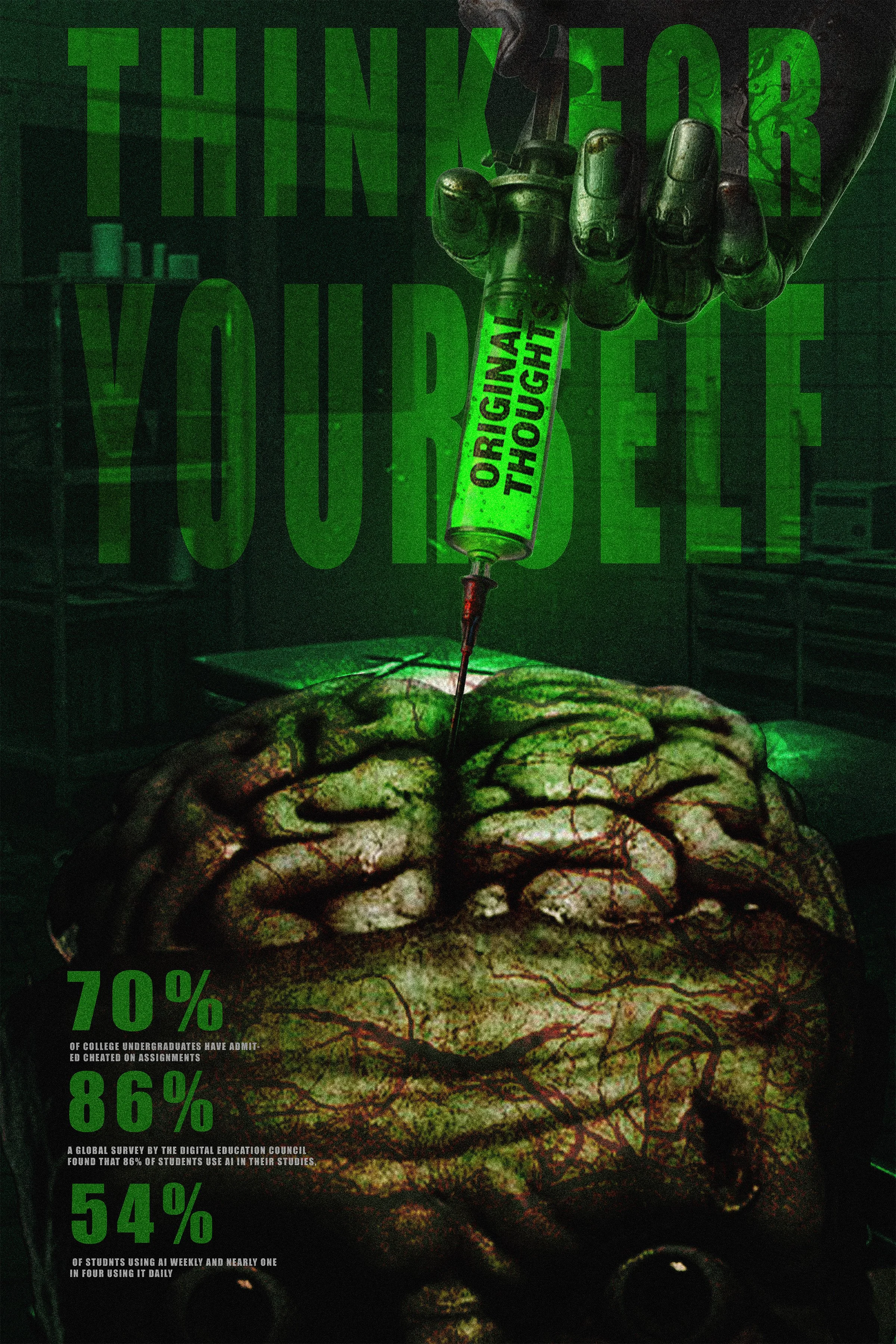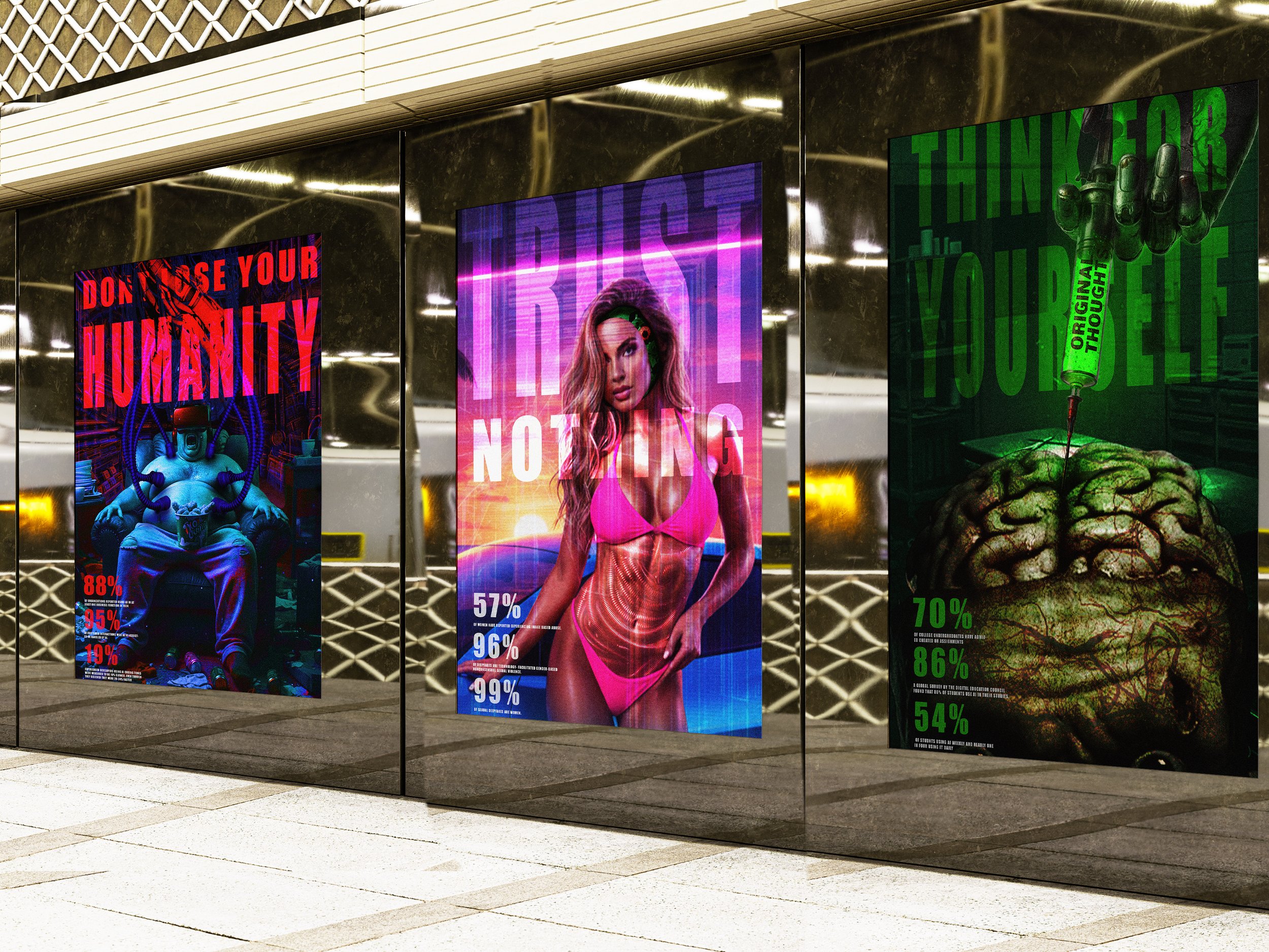 AI is coming weather we like it or not. We can either embrace it or get left behind. What I wanted to show in my project was both sides of the argument. On one side I show how people are mis-using AI and how it is effecting us negatively, on the other hand I also show how I think AI should be used by using it as a key element in all of my designs.