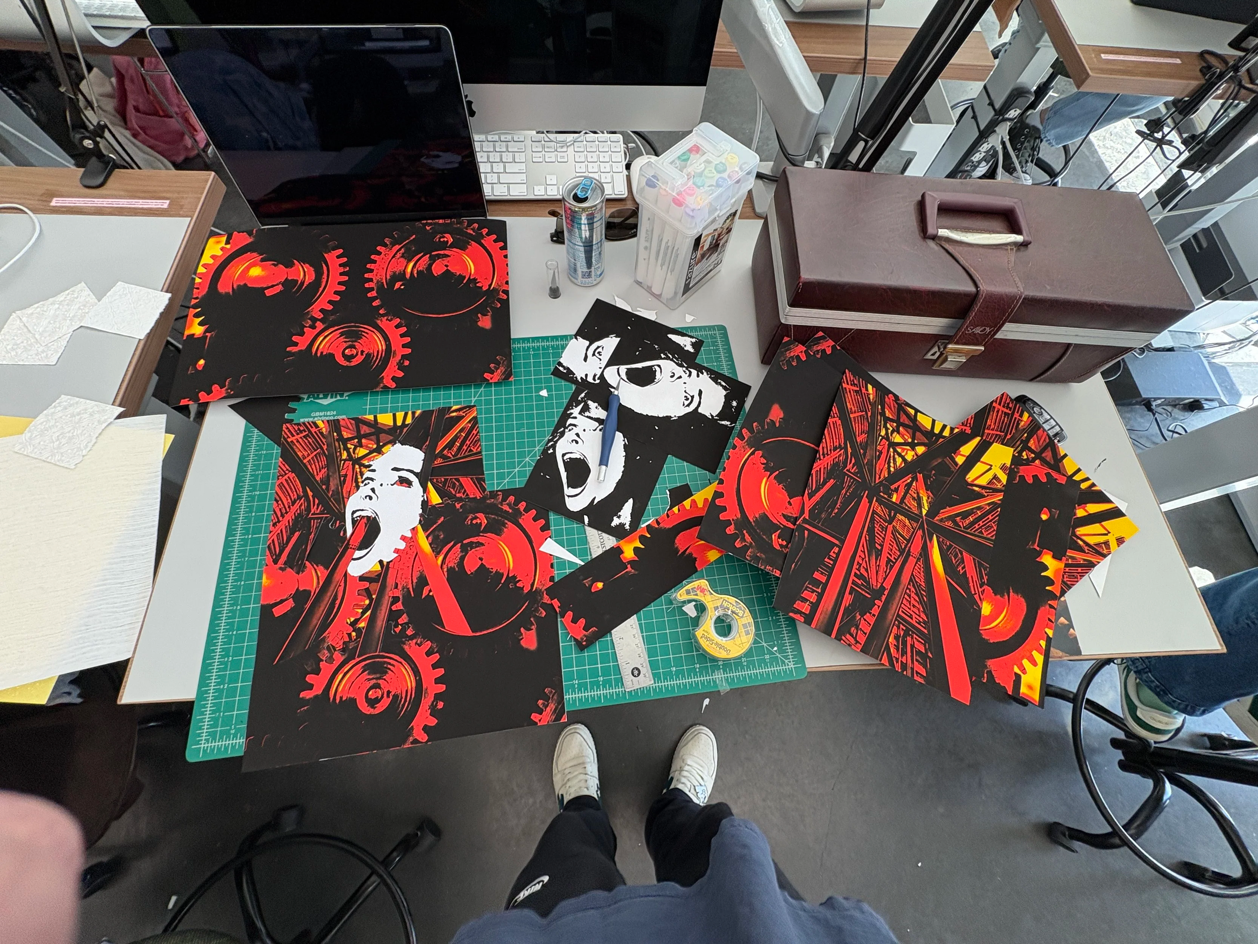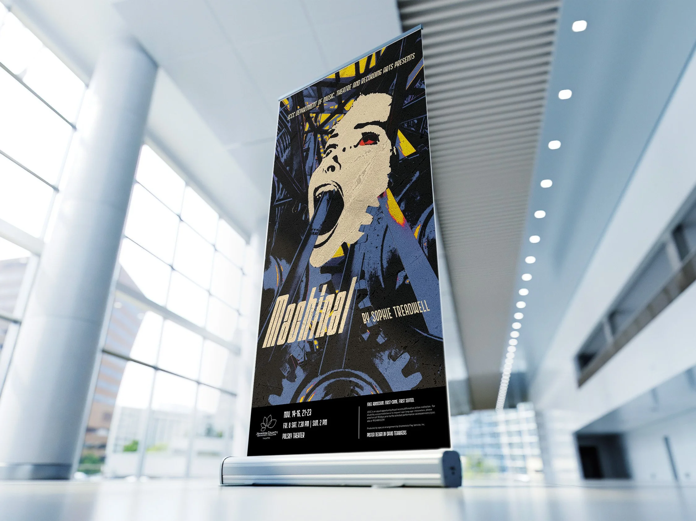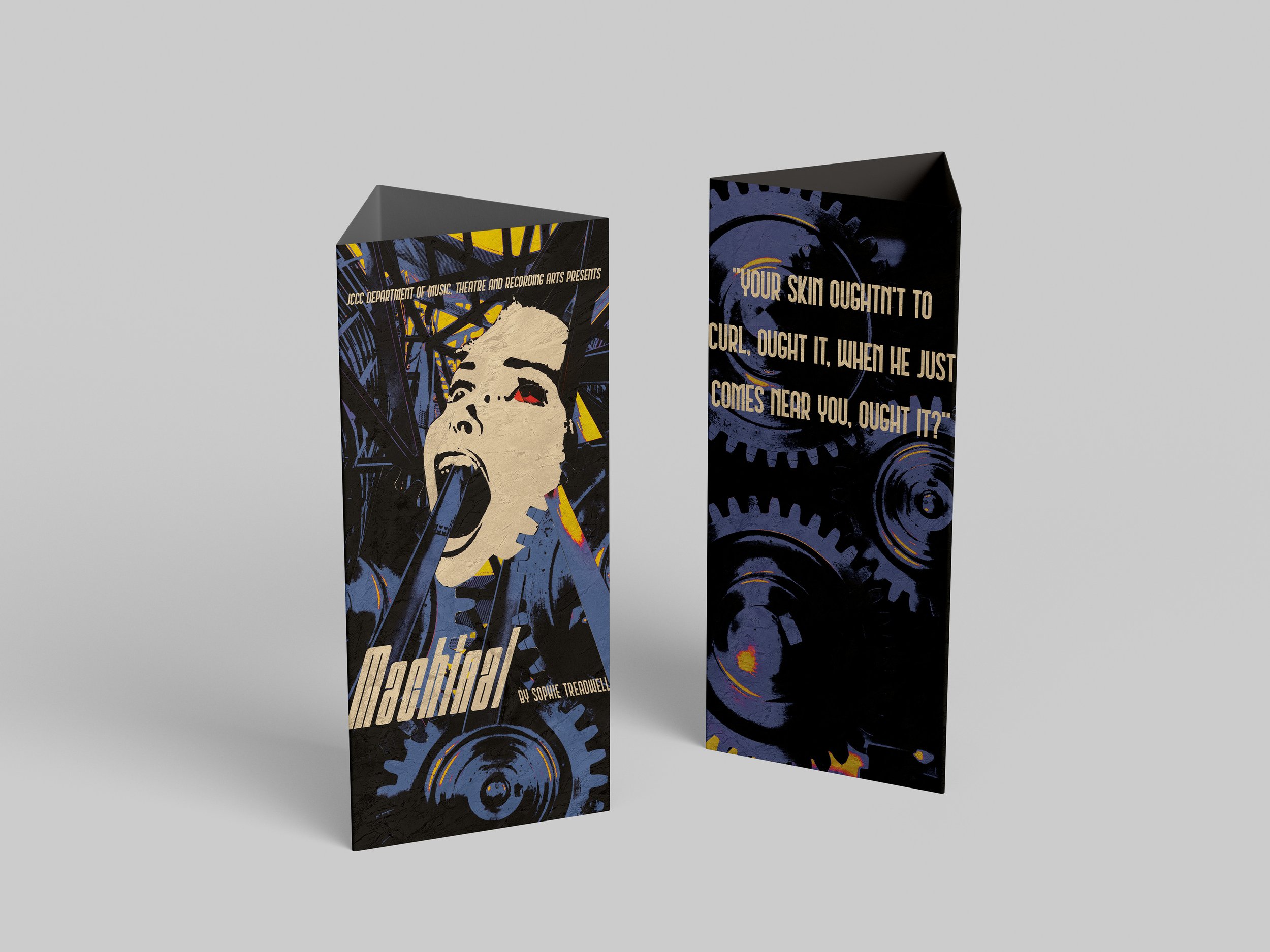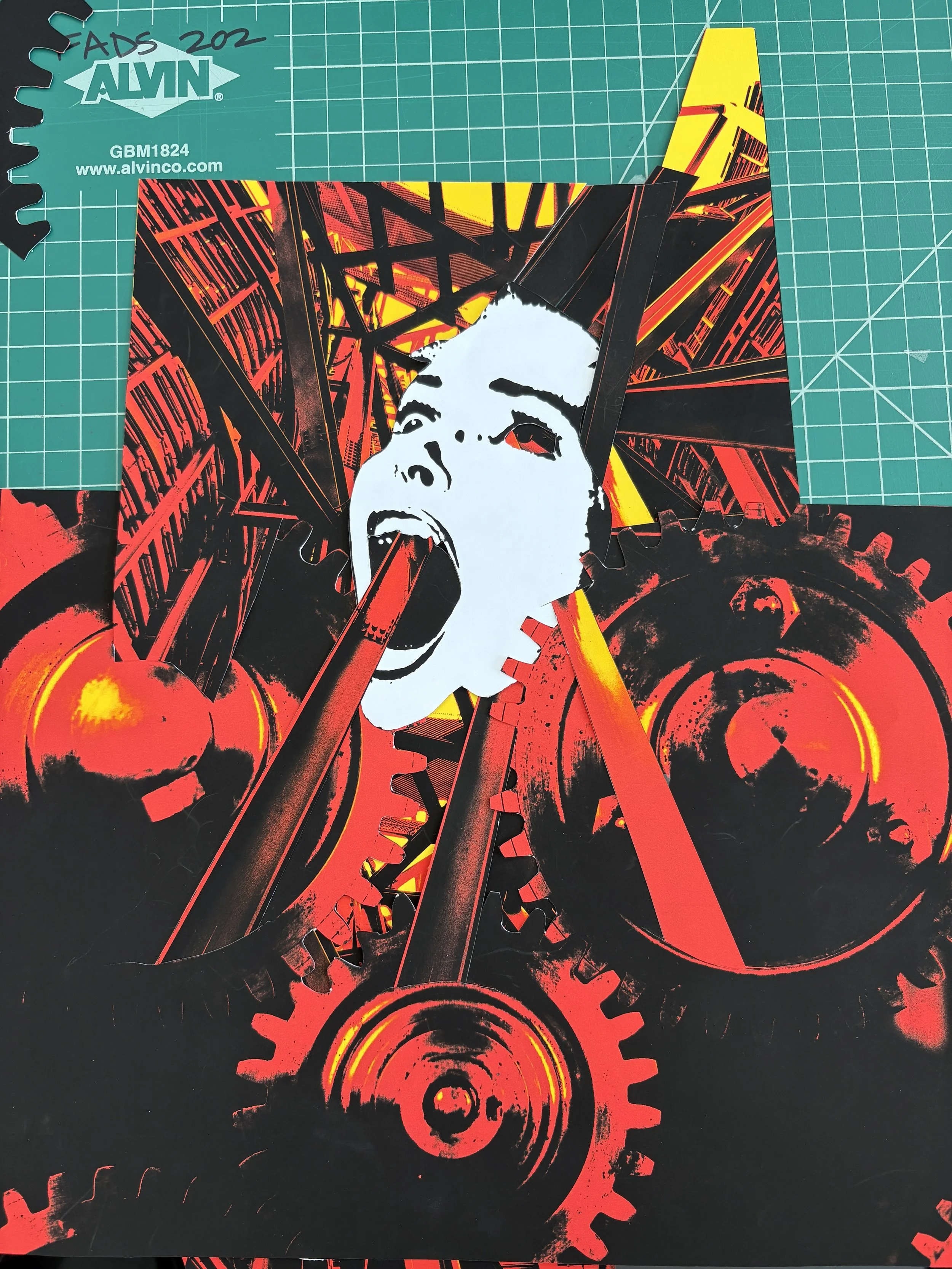 For this project I made a poster for JCCC’s theatre department, more specifically the play Machinal. The director wanted a feel that showed how the main character was being eaten by the machine of work and everyday life, I took this more literal than others. I decided to go with collage so I could manipulate the metal bars in weird and experimental ways I wouldn’t be able to if I did digital. It also gave it a great texture.