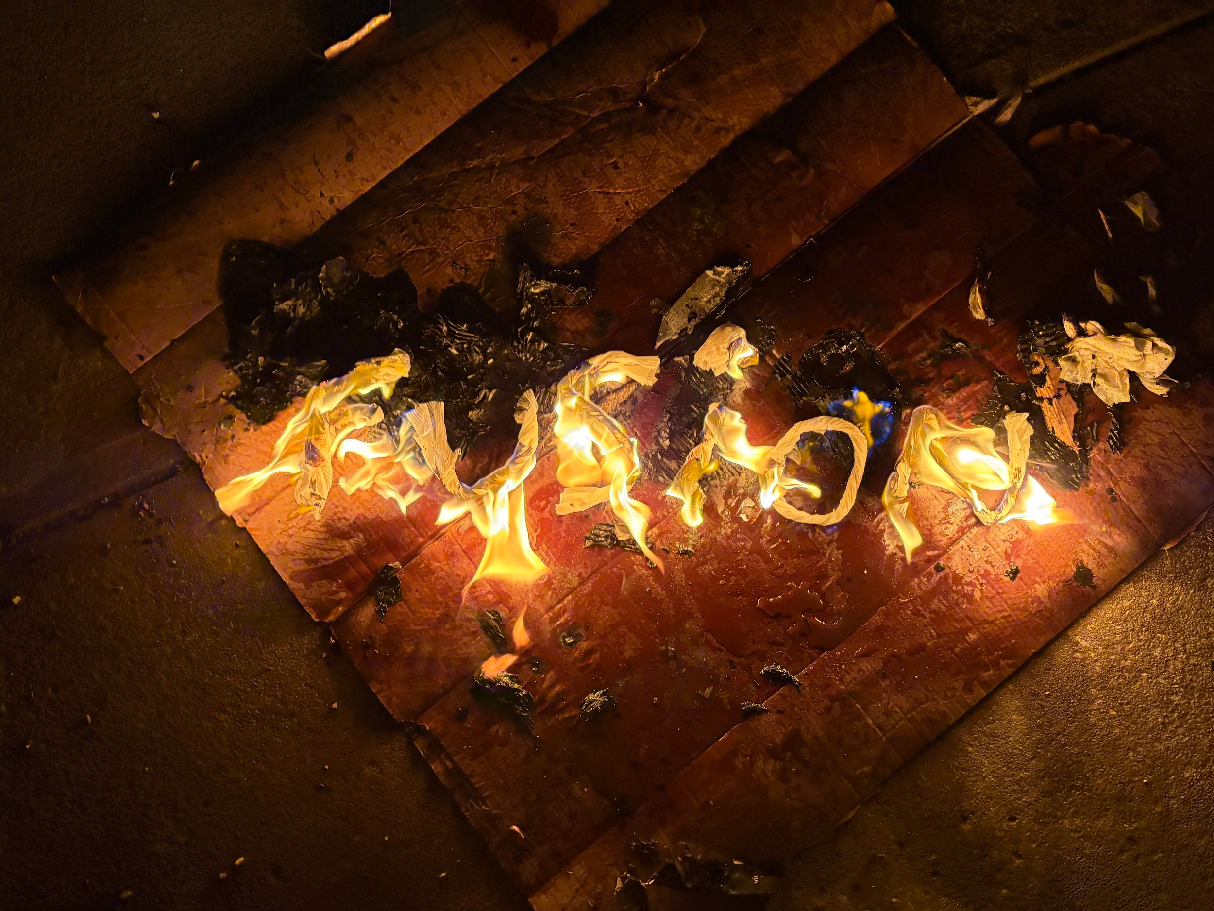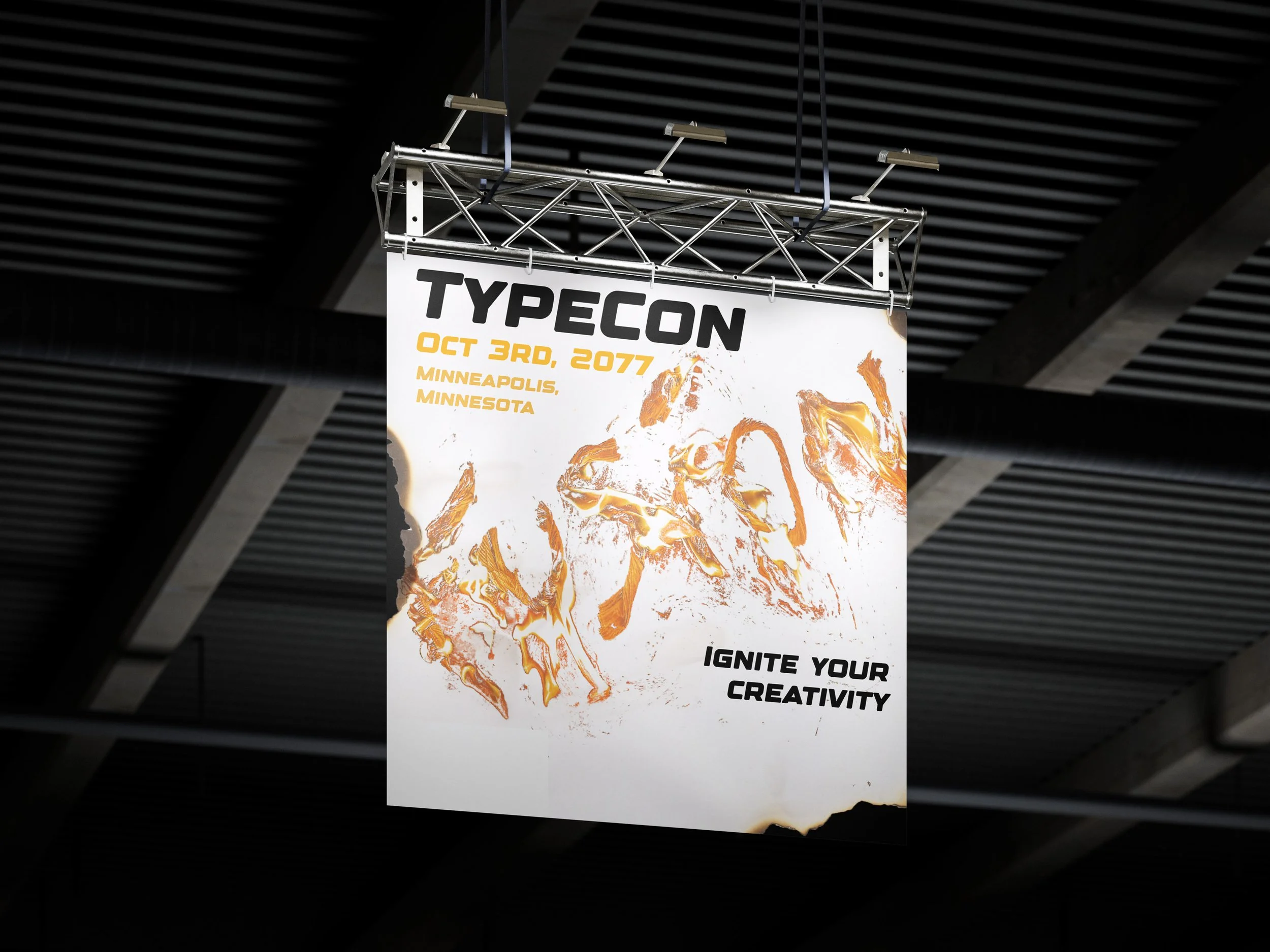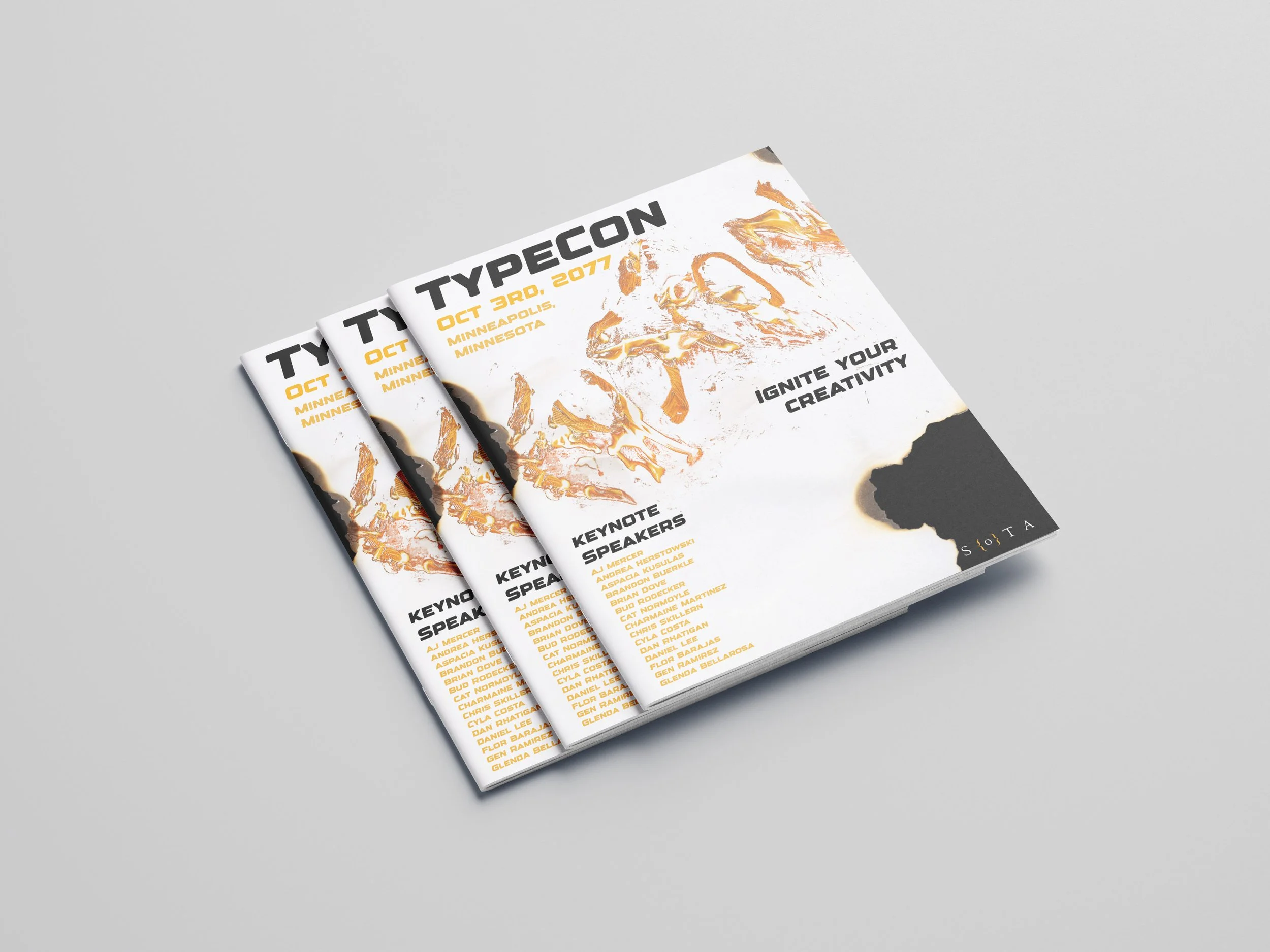 For my TypeCon project I picked the word “Fusion”, because I thought it was the one that resonated with me the most. Being energetic and fiery. So for the type on the cover I literally lit it on fire. I used paper towel rolls soaked in gasoline, arranged the letters , and then photographed them